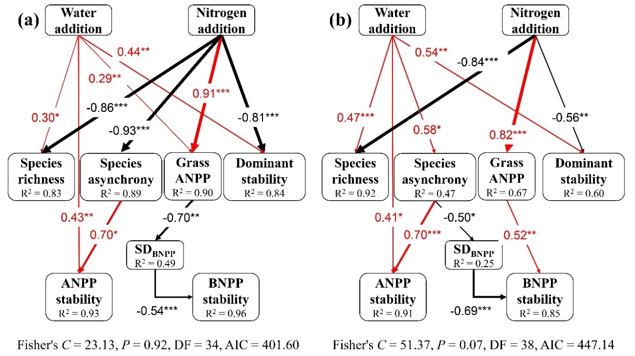 长期割草利用(图左a)和不割草(图右b)下增水和施氮对内蒙古典型草原植物群落地上地下稳定性的调控路径
