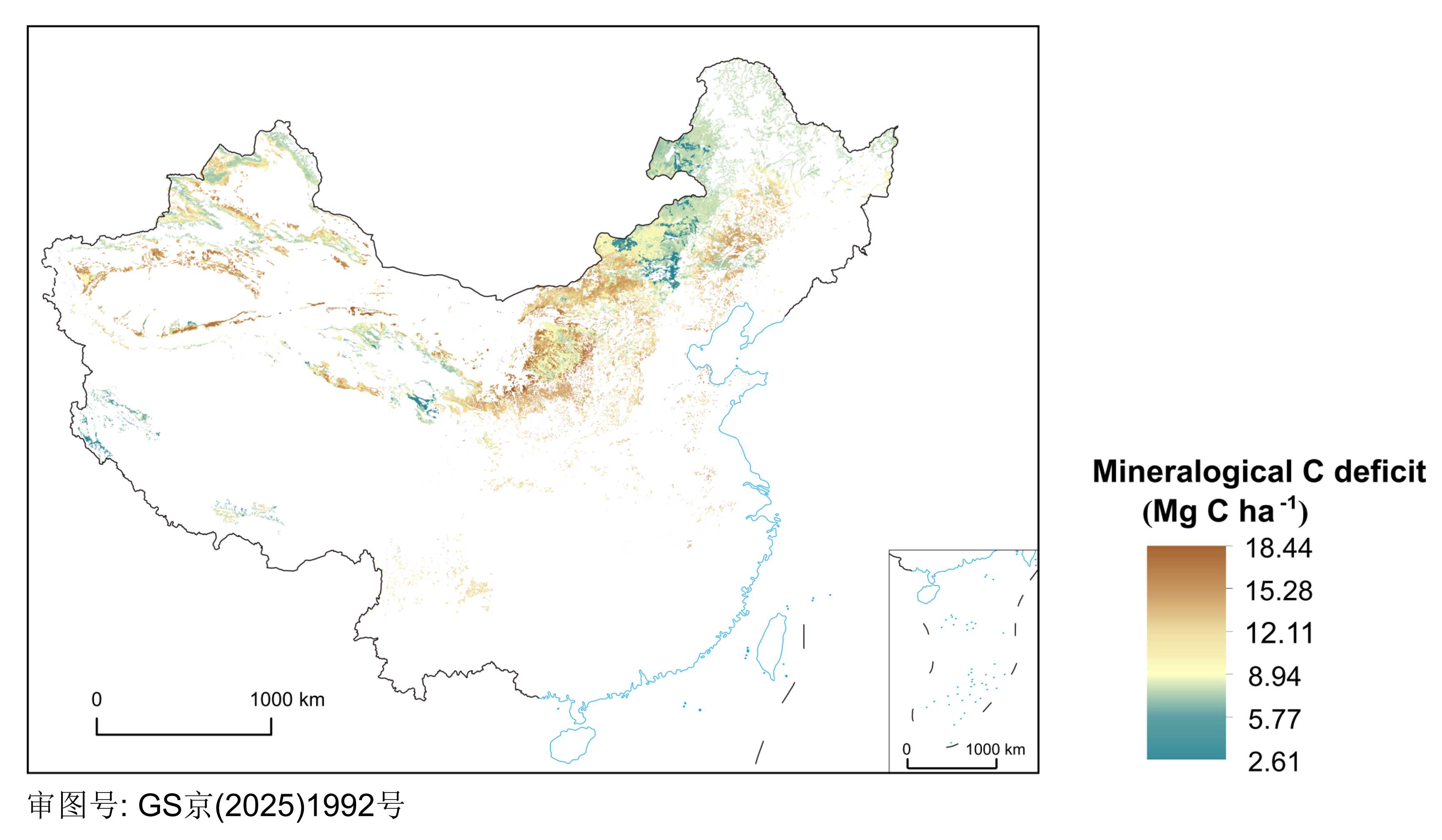 中国科学院植物研究所刘玲莉研究团队以中国温带草地为研究对象,通过2000公里样带调查,并结合13C稳定性同位素标记培养实验和机器学习建模,系统评估了矿物结合态碳(MAOC)亏缺量的空间分布及新增MAOC的形成效率。碳亏缺量反映了当前土壤MAOC含量与其理论碳饱和容量间的差距,数值越大,潜在固碳空间越大。结果表明,中国温带草地碳亏缺高值区域主要分布在退化区和干旱区,其表层0—15 cm土壤固碳潜力为0.78 ± 0.08 Pg C;人类活动通过减少土壤细颗粒含量加剧土壤碳亏缺。然而,在碳亏缺较高的区域,由于有机碳、养分和微生物活性不足,新增MAOC的形成效率较低,导致潜在固碳空间难以有效转化为稳定碳库。