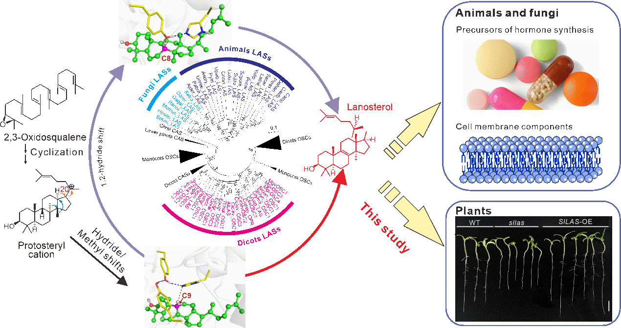 三萜环化酶可催化2,3-氧化鲨烯生成多种三萜骨架化合物。其中,羊毛甾醇合酶(LAS)催化生成的羊毛甾醇是动物和真菌中胆固醇与麦角固醇合成的前体;而环阿屯醇合酶(CAS)催化产生的环阿屯醇则是植物甾醇及油菜素内酯类化合物合成的主要前体。此前已在少数植物中鉴定到了羊毛甾醇合酶基因,但植物羊毛甾醇合酶的催化机制及其介导的代谢途径在植物中的生物学功能仍不清楚。