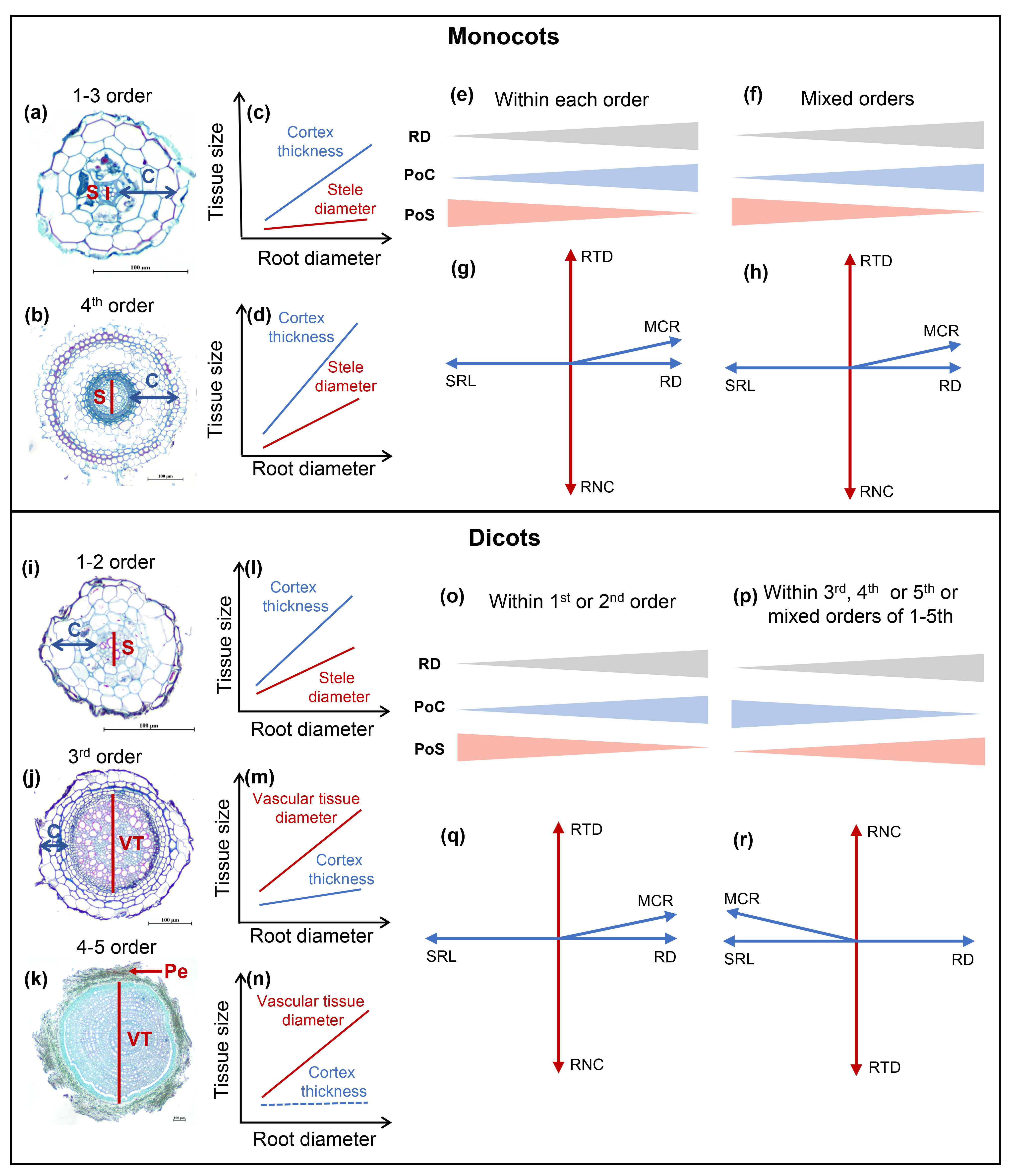 根系性状二维经济空间的提出,为理解植物资源获取策略及其对生态系统功能与过程的驱动作用提供了重要的理论框架。根系性状变异的二维性与根的解剖结构密切相关,尤其是皮层和中柱随直径的异速增长关系。近期研究表明,根系的解剖结构并非固定不变——皮层和中柱的比例会随根级显著变化。然而,目前多数相关研究往往忽视了这种解剖结构变化对根系性状经济空间的影响。