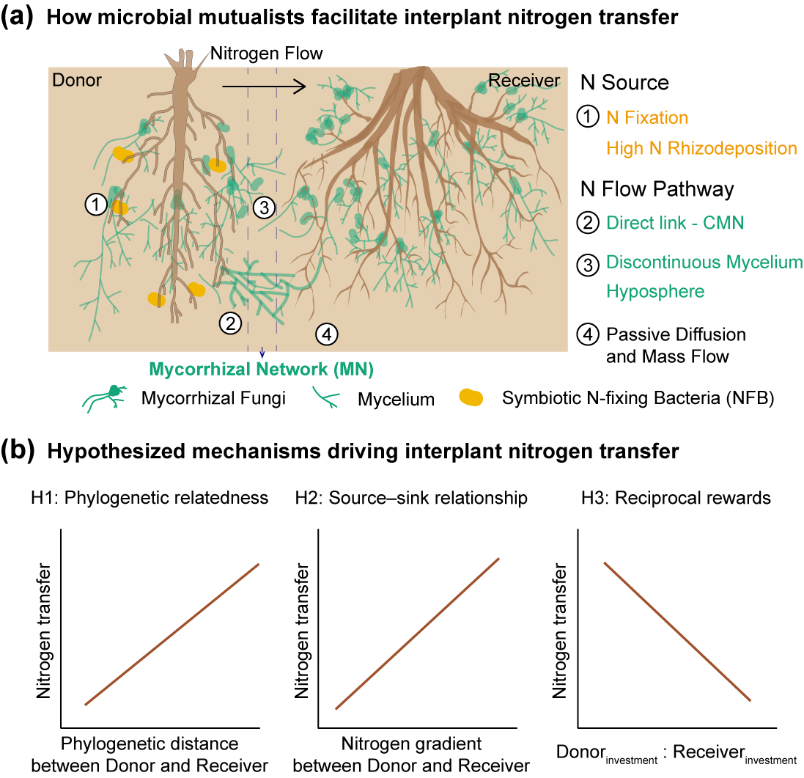 菌根和共生固氮是植物与微生物之间最常见的共生关系。共生固氮菌能将大气中的氮转化为植物可利用的形态,而菌根真菌则通过菌丝延伸扩大根系的养分获取范围,两者在植物养分吸收中发挥着关键作用。其中,菌根真菌的菌丝常常连接多个植物个体,形成庞大的地下“菌根网络”,调控植物间的养分传输,进而影响植物间的相互作用。这一现象自1960年首次报道以来,一直受到国际菌根学界的关注,并在近期再次成为争论的热点。目前,关于菌根网络与共生固氮对植物间氮素传输的贡献及其机制仍缺乏系统研究。