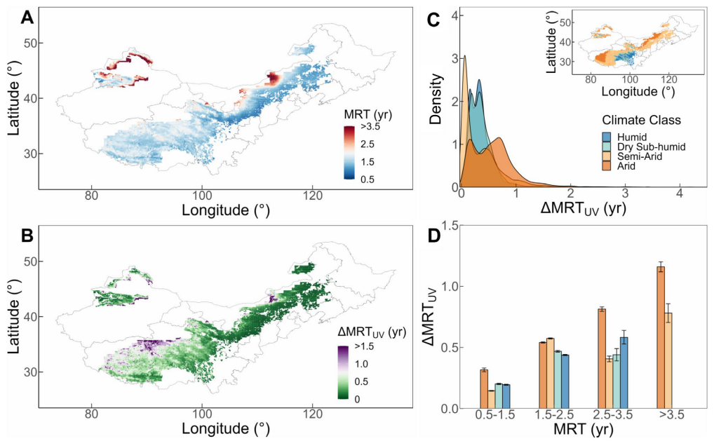 凋落物分解是陆地生态系统碳循环的关键环节,显著影响土壤碳储存与大气CO₂浓度。传统观点认为,气候条件和凋落物化学组成是凋落物分解的主要驱动因子。尽管已有研究证实紫外辐射可通过光化学途径(即光降解)加速干旱区凋落物分解,但其如何与气候、凋落物质量等传统驱动因子交互作用,进而影响区域尺度凋落物分解格局,尚缺乏系统认识。特别是在全球辐射水平变化与干旱化加剧的耦合背景下,准确量化UV辐射对陆地碳周转的贡献,已成为预测未来气候变化反馈的重要挑战。