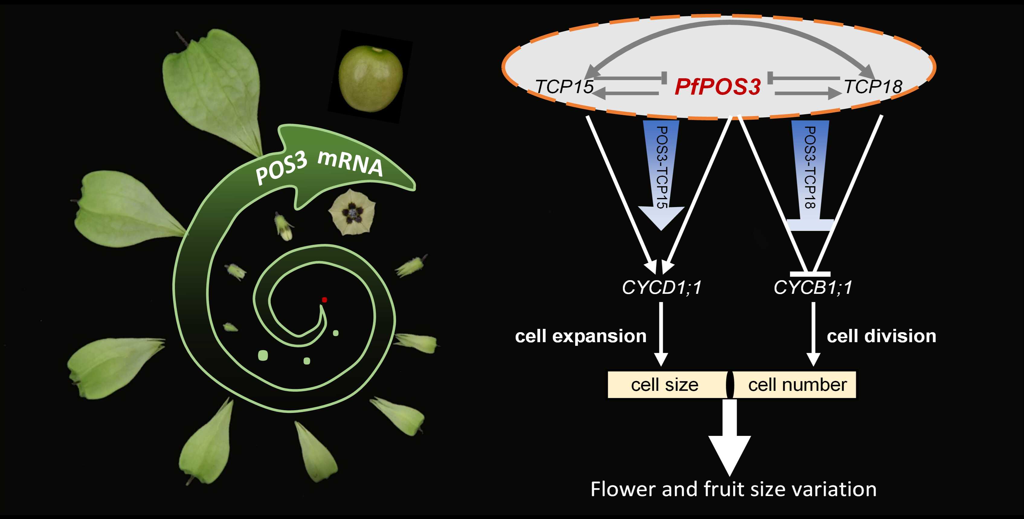 中国科学院植物研究所贺超英研究组在前期工作的基础上,对茄科毛酸浆、醋栗番茄和栽培番茄中LBD类转录因子POS3(Physalis organ size 3)进行了比较研究,并聚焦解析其调控毛酸浆果实大小的功能与机制。研究发现,POS3直系同源基因在毛酸浆、醋栗番茄和栽培番茄的生殖器官中存在异量表达,即POS3在毛酸浆的花分生组织、雌蕊、种子及果实发育中表现出较高的表达水平,而在醋栗番茄和栽培番茄这些器官及发育中的表达水平极低。敲除或敲降毛酸浆POS3基因(PfPOS3),突变植株的花器官大小、种子重量和果实重量显著降低;而过表达PfPOS3或两个茄属SlPOS3(SpPOS3)基因,转基因毛酸浆植株花器官大小、种子和果实重量显著增加。因此,POS3正调控毛酸浆生殖器官的大小。进一步分析表明POS3促进细胞膨大,抑制细胞分裂。在调控机制层面,POS3可分别与TCP15和TCP18相互作用,并且POS3-TCP模块可直接结合CYCD1;1和CYCB1;1的启动子并调控其表达,进而调控细胞膨大和细胞分裂过程,最终调控毛酸浆花的大小和果实重量。与PfPOS3相比,SlPOS3(SpPOS3)mRNA表达的显著降低很可能导致它们调控茄属花果发育的功能减弱或丧失。