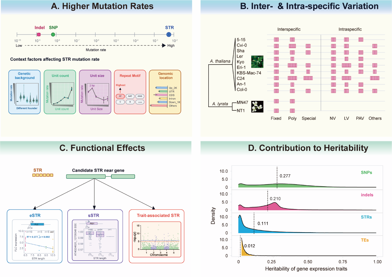 中国科学院植物研究所郭亚龙研究组通过对7个独立的拟南芥突变累积(Mutation Accumulation, MA)系进行分析,量化了拟南芥STR的突变率为 5.55×10⁻³ 每代每位点,显著高于单核苷酸多态(SNP)和短片段插入缺失的突变速率。这一结果表明STR在生物进化过程中可能具有重要的作用。在此基础上,研究人员利用高质量组装的基因组,对种间与种内STR的变异模式进行了系统分析,揭示了其变异的特点与规律。进一步结合全球分布的1168份拟南芥自然群体基因组数据,研究人员深入评估了STR长度变异对基因表达、可变剪接及表型的影响,并识别出一批显著关联的STR位点。最终,研究聚焦于STR对遗传力的贡献,发现STR对表达、剪接与表型变异的遗传力贡献分别为0.111、0.143与 0.101,表明STRs在复杂性状的遗传调控中具有不可忽视的重要作用。