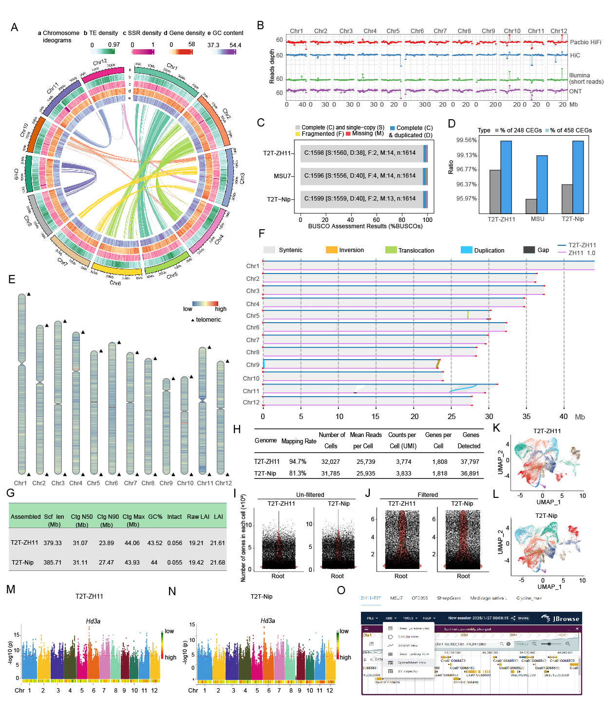 该基因组的质量经过了多组学严格验证,通过单细胞转录组、普通转录组、染色质可及性、DNA甲基化等多组学数据比对发现,以T2T-ZH11为参考时,序列比对率、基因检测数量均有提高。在完整性方面,BUSCO评估达99.01%,CEGMA评估达99.56%;碱基质量值QV达49.49,基因组组装质量的评价指数LAI达到“黄金标准”,是当前组装精度和完整度最高的中花11基因组。中花11的端粒到端粒完整基因组组装为水稻功能基因挖掘、分子标记辅助育种、重要农艺性状解析提供了“基因蓝图”,为水稻基础研究和遗传品质改良提供了重要支撑。