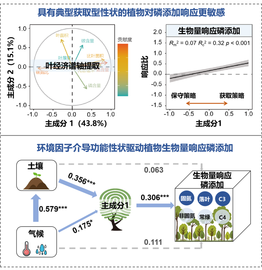 针对上述问题,中国科学院植物研究所植被结构与功能研究组系统量化了磷添加对物种水平植物生物量的影响,评估了叶片功能性状与气候、土壤因子和施肥条件对植物生物量响应磷添加的相对贡献。研究结果表明,不同固氮类群、叶习性与光合途径的植物生物量对磷添加的响应存在高度变异。功能群的磷响应变异与叶片经济学谱密切相关,表现出具有典型获取型性状的植物对磷添加响应更敏感。同时,气候和土壤因子主要通过介导叶片经济学谱性状,驱动植物生物量对磷添加的响应。研究首次在物种水平上证实叶片经济策略是介导植物对磷添加响应差异的关键因素,补充了植物“资源获取-利用”策略理论与养分添加效应的关联机制。研究结果为优化陆地生态系统模型(如碳-磷循环耦合过程)提供了关键参数和理论基础,为预测未来磷沉降加剧下的植被动态与碳汇潜力提供了科学支撑。
