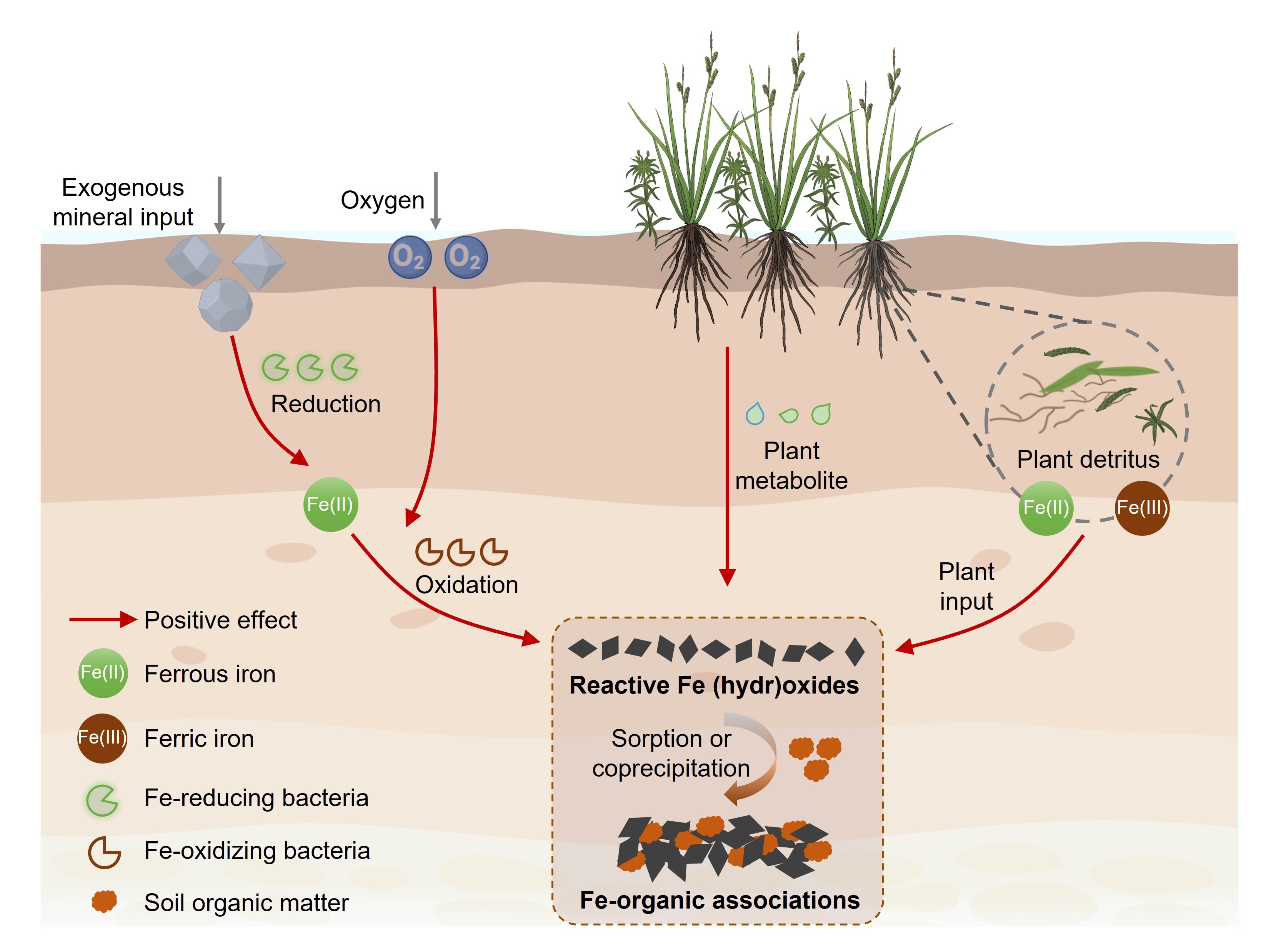 湿地活性铁氧化物和铁结合有机碳形成与积累机制概念图