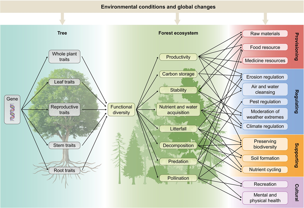森林是“地球之肺”和生命的家园,承载着重要的生态系统功能。然而,环境变化与人类活动导致的森林退化,正威胁着全球可持续发展。为应对这一挑战,全球范围内正推进大规模森林恢复工程,旨在重塑森林的生物多样性、结构与功能,为人类与自然和谐共生提供保障。尽管人工植树造林已有长期经验,但当前全球森林恢复面临全新难题:如何在提升生态系统生产力的同时,兼顾生物多样性保护及多种生态系统功能的协同提升?功能多样性作为连接物种多样性与生态系统功能的关键纽带,受到了广泛关注。然而,功能多样性驱动生态系统功能的核心机制仍不明确,不同类型功能性状多样性对各类森林生态系统功能的作用路径也缺乏系统性区分与整合,难以为森林恢复实践提供具针对性且可操作的策略支撑。