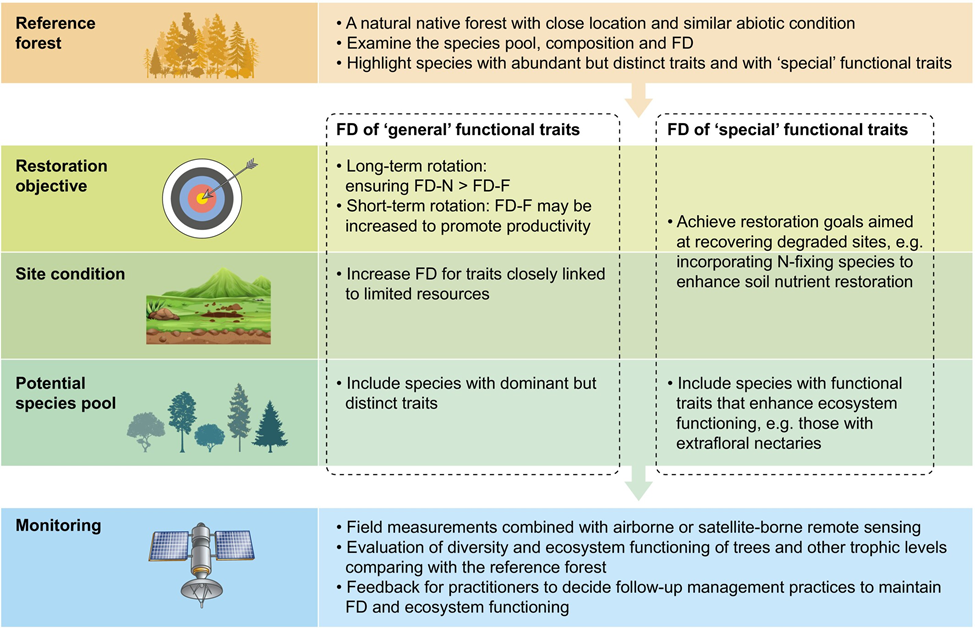 在森林恢复应用层面,该综述提出将功能多样性系统融入恢复方案,纳入“参考森林”、恢复目标、立地条件、功能性状类别及潜在物种库等关键要素,提出了一套具有可操作性的森林恢复路径。该路径涵盖从基于功能多样性来制定恢复目标,到通过功能性状动态监测评估恢复成效的全过程,为实现森林生态恢复的“多目标、高质量、长期化”提供了理论支撑与实践指导。