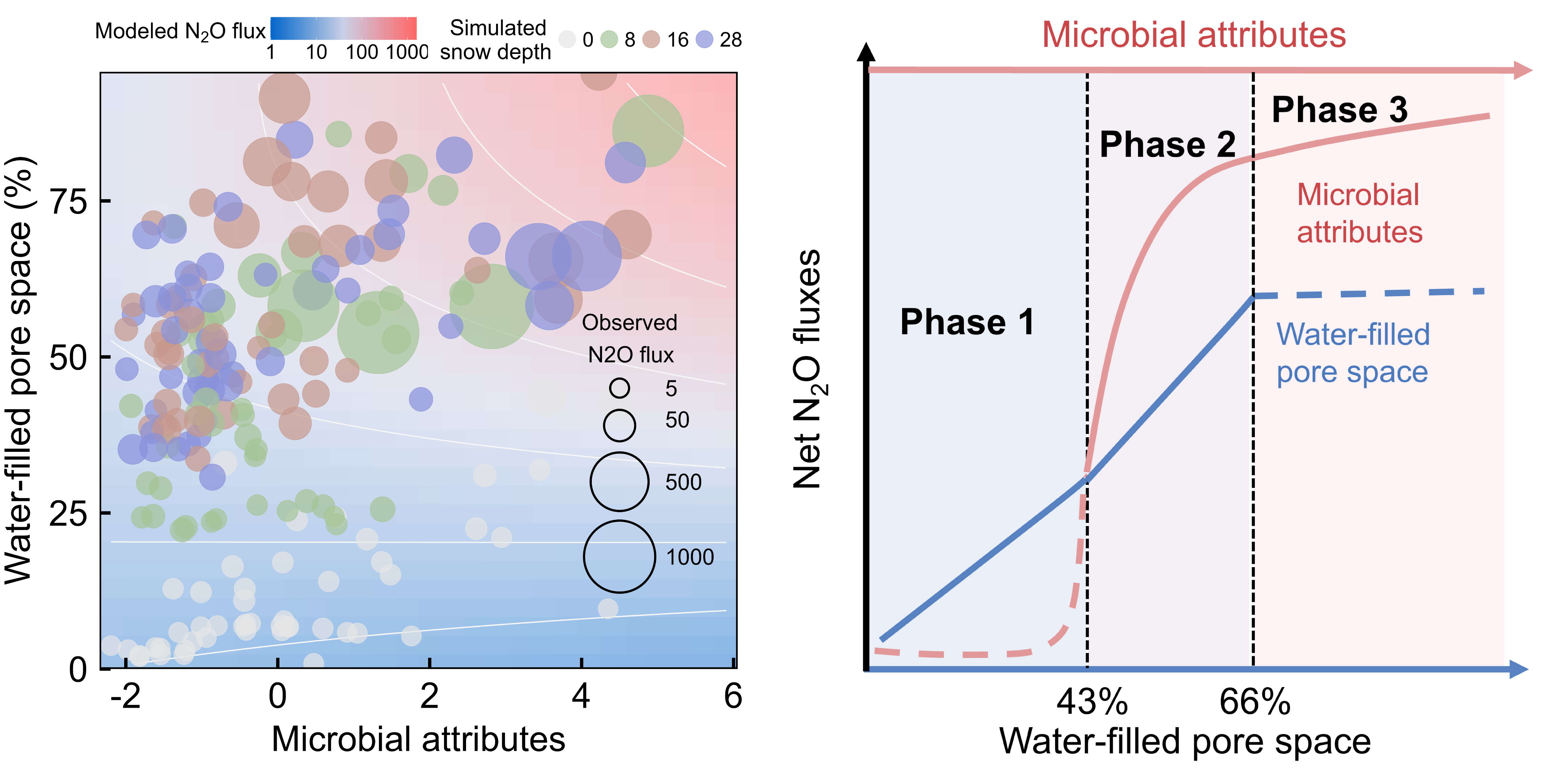 针对这一问题,中国科学院植物研究所刘玲莉研究组以内蒙古温带草地为研究对象,依托长期野外增雪实验平台,利用原位高频温室气体监测设备,实时追踪N2O排放通量,并结合多种草地类型土柱微宇宙培养实验,探讨了冬季增雪条件下冻融过程驱动N2O排放的生物与非生物机制。研究发现,冬季增雪会显著促进冻融期N2O脉冲排放,持续约50天的冻融期贡献了超过全年50%的总排放量。同时,冻融期N2O脉冲表现出显著的空间异质性,排放通量在3–1100 μg N m-2 h-1范围内波动。尽管存在显著的时空变异,但这一变异可由水分‒微生物共同驱动的层级调控机制来解释:当充水孔隙度(WFPS)小于43%,土壤水分为主要限制因子;当充水孔隙度在43%–66%时,水分与微生物特性(反硝化基因丰度、氮转化酶动力学参数和微生物生物量)协同驱动;当充水孔隙度在66%以上,微生物功能(尤其氮转化酶活性)成为唯一控制因素。