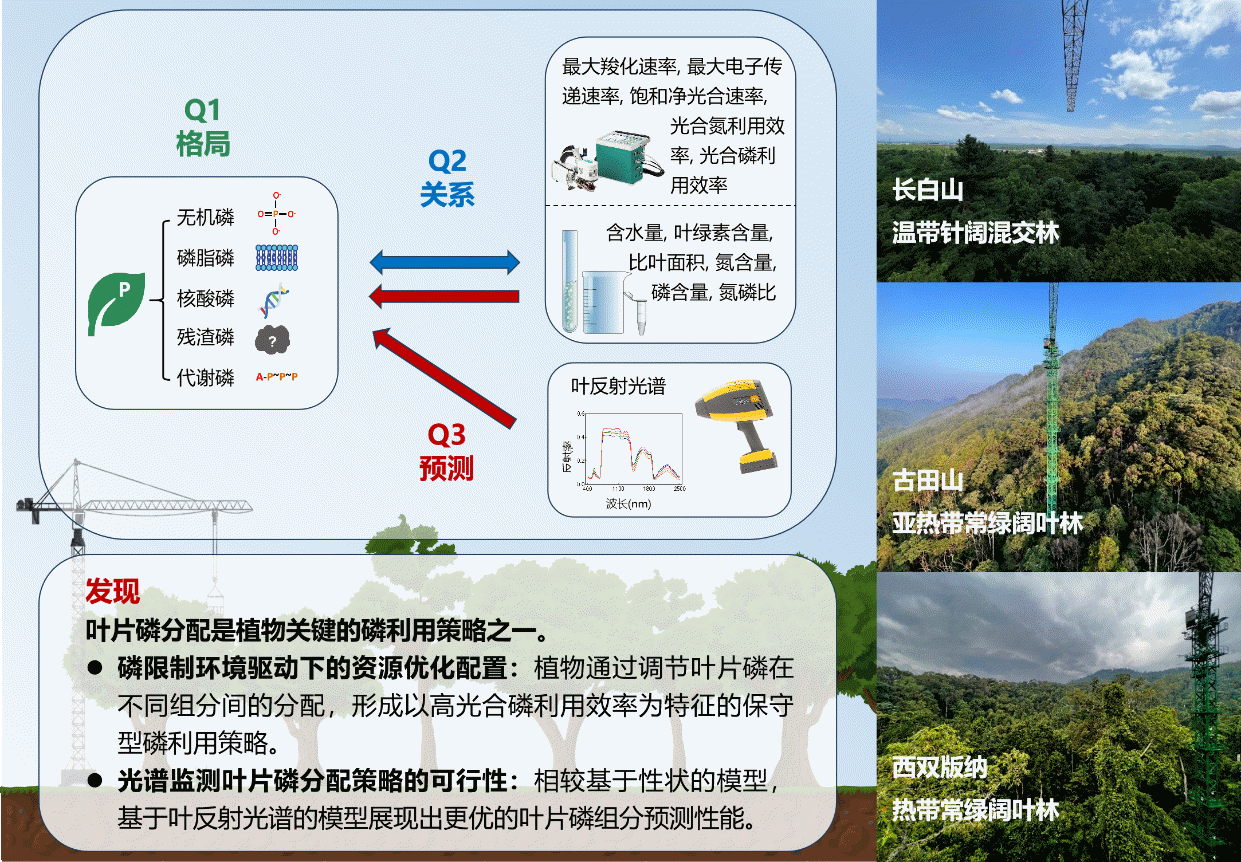 针对上述问题,中国科学院植物研究所植被结构与功能研究组依托中国科学院多个林冠塔吊平台,采集了我国三大典型森林生态系统(吉林长白山温带阔叶林、浙江古田山亚热带常绿林、云南西双版纳热带雨林)的林冠叶片样本。通过整合叶经济学谱与高光谱遥感技术,解析了跨气候带森林叶片磷分配格局。研究结果表明,磷限制环境驱动了植物磷资源的优化配置,植物通过减少叶片磷向无机磷和磷脂磷的分配,将更多的磷分配给核酸磷和代谢磷,形成以高光合磷利用效率为特征的保守型磷利用策略。此外,虽然叶片磷组分与叶经济性状存在密切联系,但基于叶反射光谱构建的偏最小二乘回归模型展现出更优的预测性能。本研究首次从跨气候带视角揭示了森林生态系统叶片磷分配策略的环境适应机制,建立的“光谱-磷组分”定量反演模型突破了传统化学分析方法的技术限制,为全球变化背景下森林生态系统植物磷利用策略的动态监测提供了创新技术手段。研究结果进一步深化了对植物磷利用策略的理论认知,也为改进陆地生态系统模型中的磷循环过程提供了关键数据支撑。