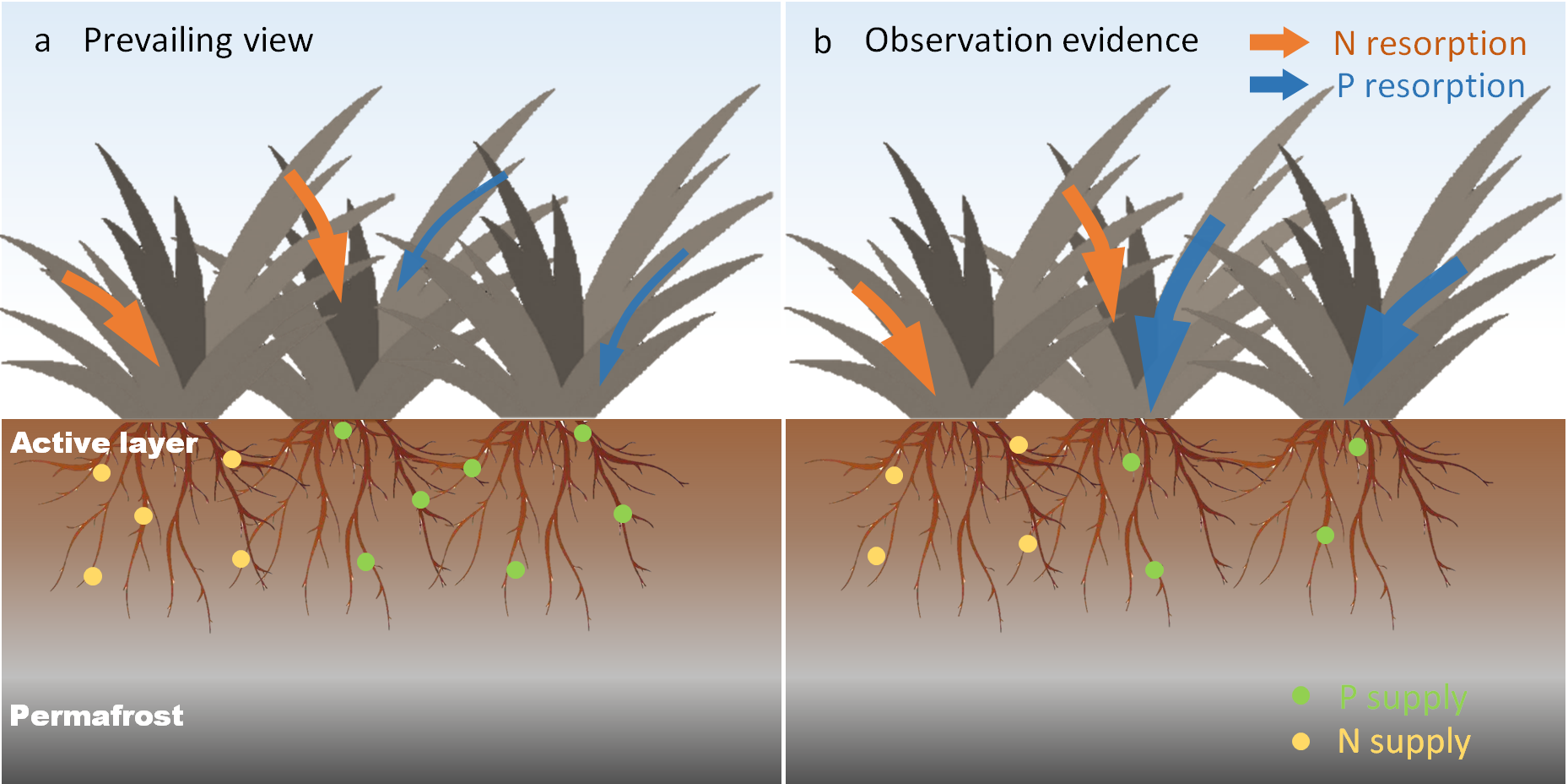 植物养分重吸收是指将原本可能流失的养分重新捕获、回收并再利用的过程。该过程是植物获取和利用养分的重要策略,尤其是在养分限制的冻土生态系统中,对于维持植物生长至关重要。按照以往基于热带、亚热带和温带地区的观测数据得出的推论,寒冷地区植物叶片氮重吸收效率通常高于磷。然而,由于缺乏系统性观测数据,这一推论尚未得到充分验证。