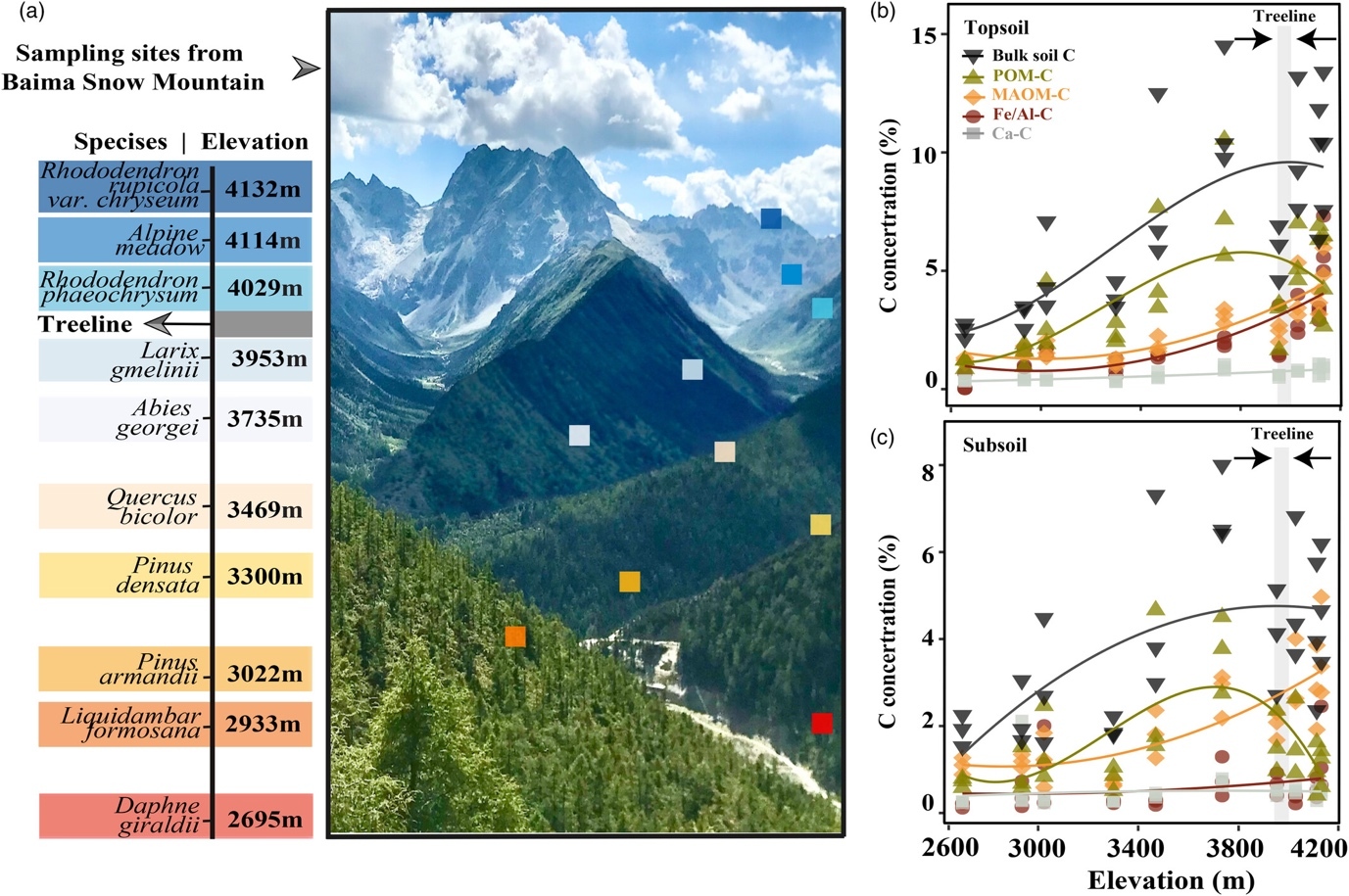中国科学院植物研究所刘玲莉研究组以白马雪山为研究对象,沿近2000米海拔梯度,采集了从亚热带阔叶林、温带针阔混交林、亚高山针叶林、亚高山灌丛到高山草甸等10个植被类型的植物和土壤样品,解析了土壤总碳及其不同稳定性组分的海拔分布格局和阈值动态。结果表明,在林线以下海拔每上升1000米,表层土壤和底土中的土壤碳浓度分别增加5.11%和2.11%,但超过林线后便趋于平稳。这一平稳现象是由颗粒有机碳(POM-C)的减少抵消了矿物相关有机碳(MAOM-C),尤其是铁/铝氧化物相关碳(Fe/Al-C)的持续增加所造成的。进一步分析发现,POM-C、MAOM-C和Fe/Al-C的不同反应与林线附近植物、微生物和土壤地球化学性质的突变密切相关。表层土壤POM-C的下降可能主要归因于植被过渡到亚高山灌丛时地上凋落物输入的减少,而底层土壤POM-C的下降与林线以上细根生物量的迅速减少密切相关。相比之下,稳定性土壤碳组分MAOM-C及其组分Fe/Al-C的积累主要受弱晶态的铁/铝氧化物的调节,同时也受到细根生物量和微生物生物量的调控。