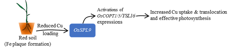 为了解析水稻在红壤环境中的适应性生长机制,中国科学院植物研究所刘春明研究员等将化学诱变处理后的第三代水稻突变群体分别种植于具有典型褐土的北京和具有典型红壤土的海南,发现了一个红壤敏感突变体rss1。该突变体在褐土种植条件下可以健康生长和结实,但在红壤土种植则呈现迟滞、幼叶失绿、分蘖数减少及不育等表型。进一步分析表明,在红壤种植条件下,rss1地上部分铁浓度显著升高,而铜浓度显著降低。图位克隆结果表明,rss1的红土敏感表型是由一个SPL家族转录因子基因突变引起。该基因编码OsSPL9转录因子,在叶片和根的维管组织中高表达。精准控制的水培实验显示,在高铁条件下rss1突变体表现出缺铜表型,且该表型可通过提高水培液中铜含量或过表达铜转运蛋白OsYSL16得到部分恢复。生化分析证实,OsSPL9通过直接结合铜转运蛋白(OsYSL16、OsCOPT1和OsCOPT5)的启动子区域,激活其表达。这一研究结果表明在红壤土种植条件下,水稻通过在根部表面形成铁膜以抵御高铁毒害,但该过程同时抑制了铜的吸收和转运,导致铜缺乏。在自然驯化过程中,OsSPL9在维管束的高效表达激发了铜转运蛋白的表达水平,促进了铜的吸收和运输,从而克服高铁引起的铜缺乏问题。这一研究不仅提升了我们对水稻铁-铜稳态调控的理解,也为高铁红壤区作物遗传改良提供了理论依据。
