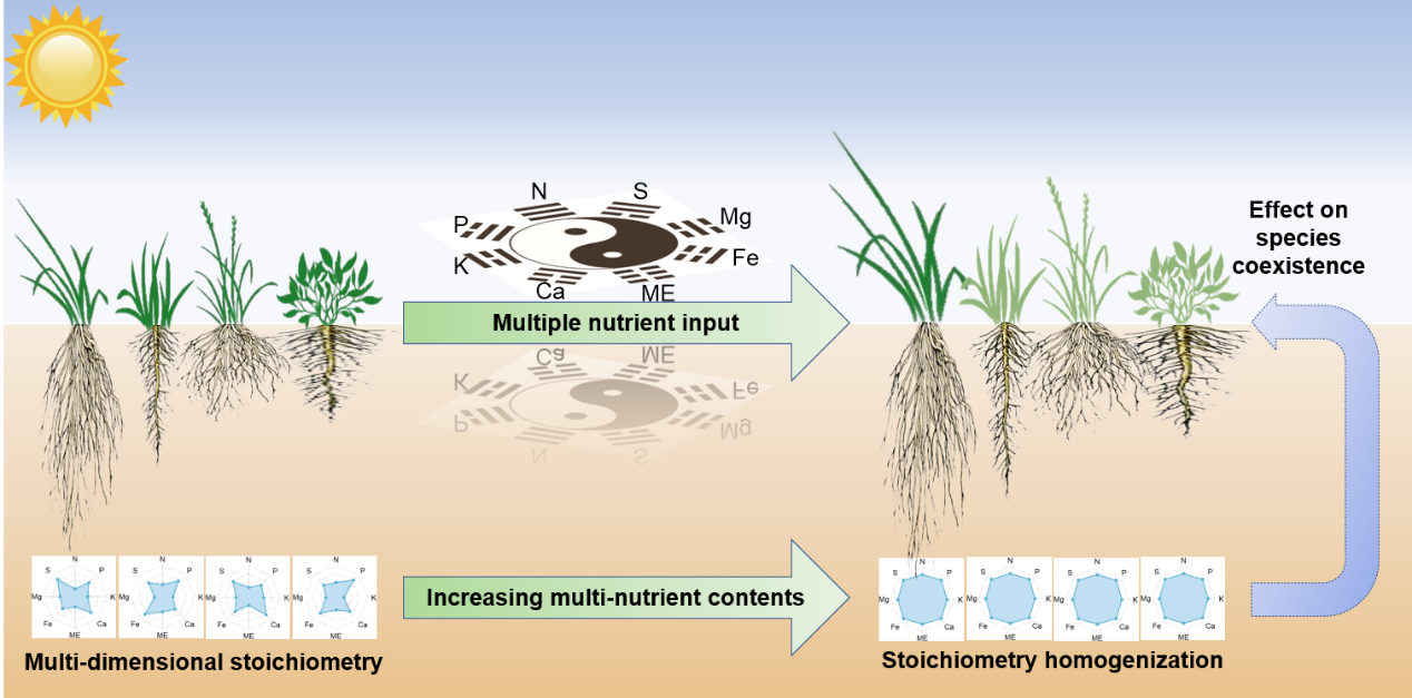 中国科学院植物研究所北方草地生态学与可持续发展研究团队依托2017年在呼伦贝尔草甸草原(欧亚草原最东端)建立的包含17种元素的多养分添加实验平台,通过长期研究,发现元素添加能够提高植物多数元素养分含量,但土壤养分有效性提高幅度远远大于植物养分含量的变化;更重要的是,同时添加多种养分使得群落中不同植物物种的营养元素组成变得更加相似,即多种养分添加会引起群落内共存物种元素化学计量生态位的同质化,导致物种之间在养分利用比率方面的差异缩小,种间竞争排除作用加剧,进而威胁生物多样性。