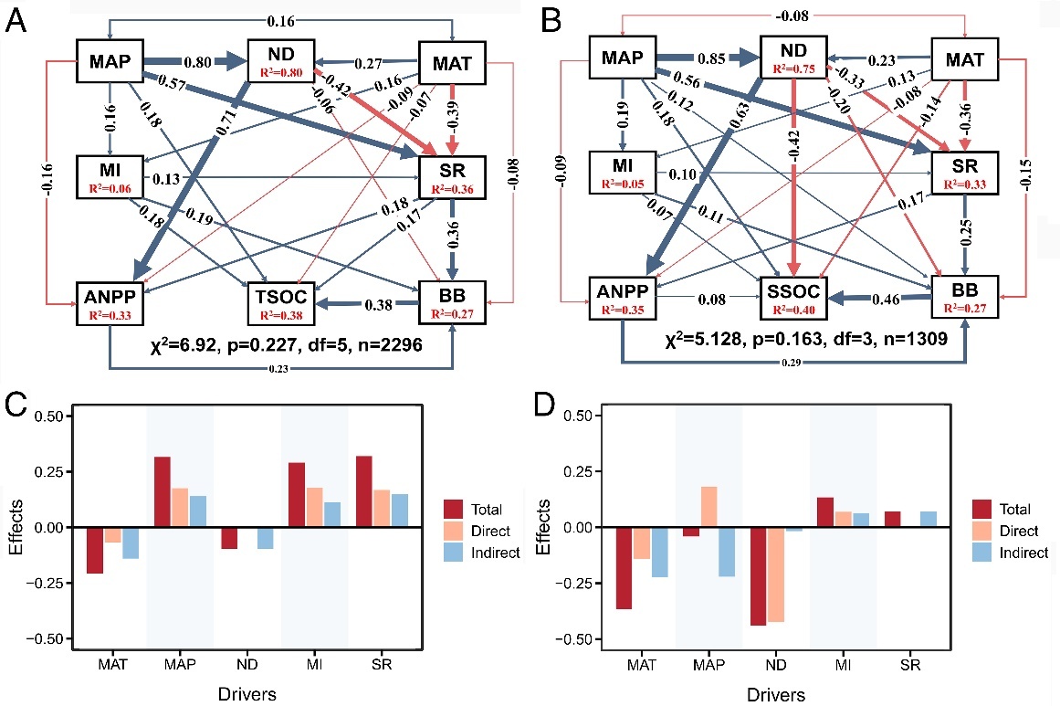 生物因素和非生物因素对影响草地土壤有机碳储量的结构方程模型