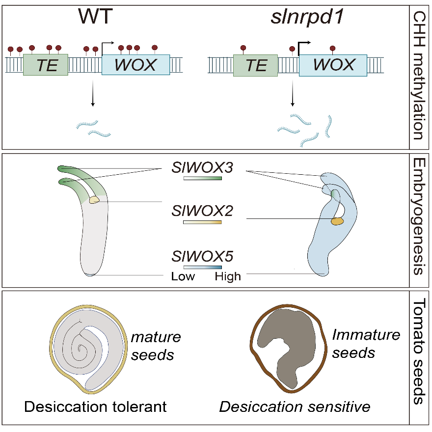 中国科学院植物研究所王台研究组解析了RdDM对番茄胚胎发育和种子脱水耐性的影响。研究发现SlNRPD1的失活导致CHH甲基化水平和24-nt siRNA的显著降低,同时伴随着内切核糖核酸酶SlDCL2b/c/d的特异性激活与21-22 nt siRNA的积累。在番茄中,转座元件(TEs)和非TE重复序列通常位于SlWOXs和SlPINs基因体内或附近,而AtWOXs和AtPINs基因座上的转座子和重复序列相对较少。NRPD1的缺失引起的重复序列CHH低甲基化可能通过改变WOX/auxin信号通路的基因表达,进而导致胚胎发育缺陷和种子不育。该研究为理解DNA甲基化在植物生殖发育中的调控机制提供了新的视角,为作物育种提供新的策略。