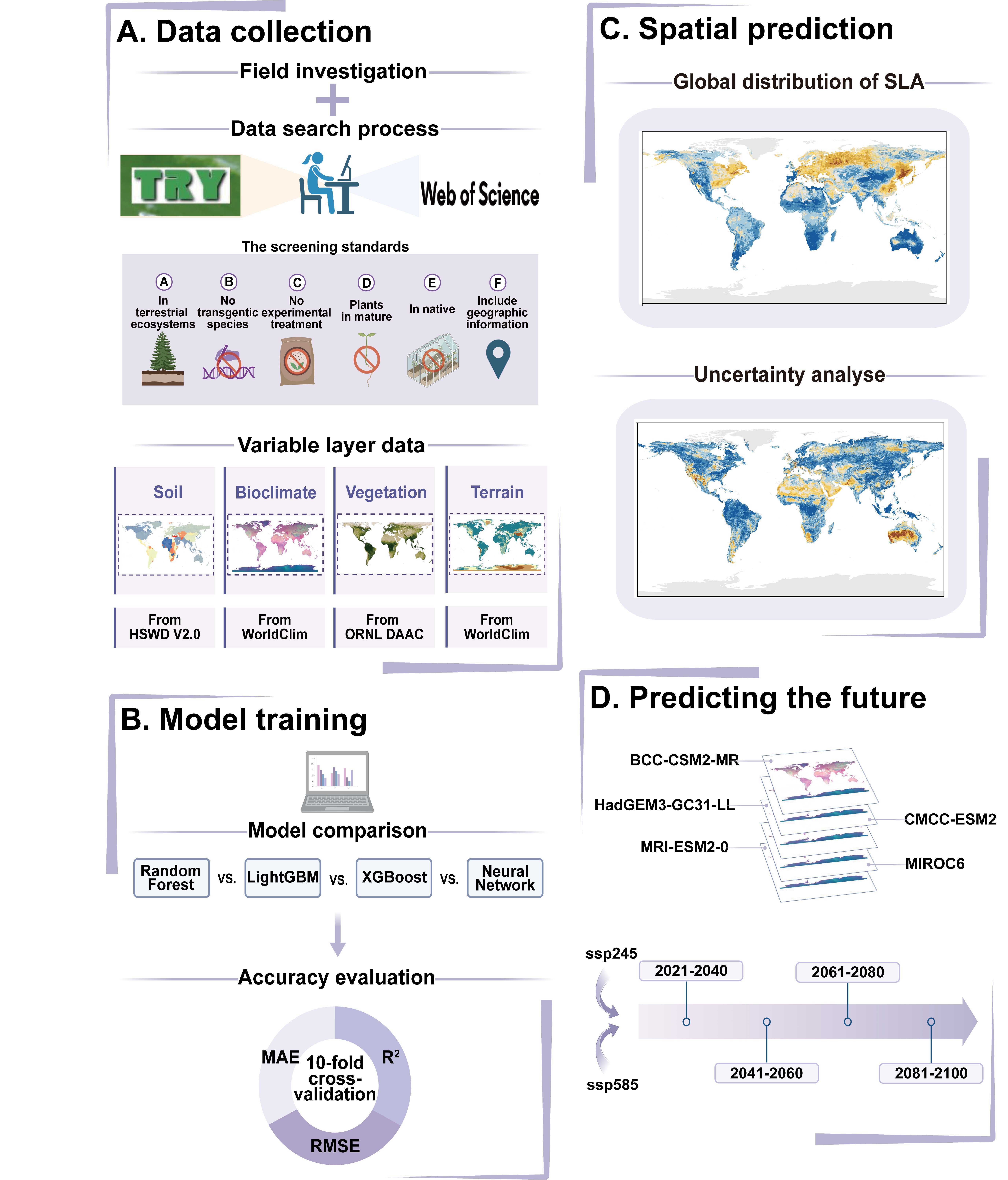 中国科学院植物研究所许振柱研究员等整合文献、数据库及野外调查等数据,构建了一个全球SLA综合数据集(含282个科、5687种,2437个采样点)。采用数据分析、机器学习、模型模拟等联合手段,特别是通过4种机器学习模型(随机森林、LightGBM、XGBoost和神经网络)的运行、完善和比较,筛选出随机森林模型作为最优模型,并进行超参数优化、不确定性分析等,构建覆盖当前及未来气候情景、贯穿21世纪的全球连续SLA空间分布图。重点探讨了全球陆地生物群系中SLA的空间分布特征、全球主要生态区和植被类型的SLA生物地理分异规律、在未来气候变化情景(共享社会经济路径 SSP2-4.5、SSP5-8.5)下的SLA变化特征及潜在分布格局等3个科学问题。