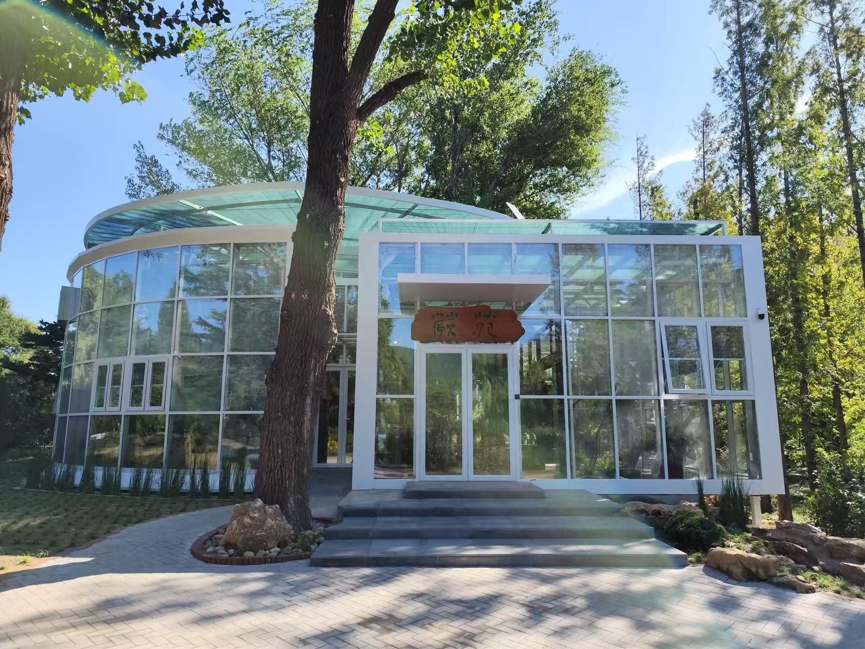 石松类与蕨类植物保育温室(蕨苑)位于紫薇专类园西南侧,总建筑面积220m2。温室为钢架结构,整体造型巧妙的利用地势高差通过方圆立体玻璃幕墙组合,与水杉林浑然一体。