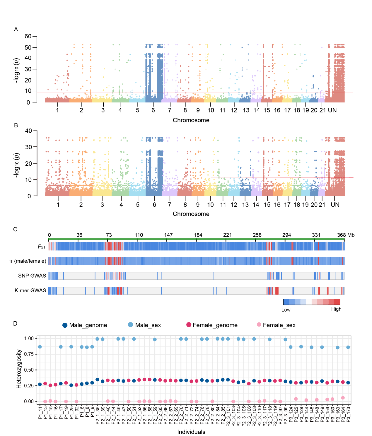为探讨上述问题,汪小全研究团队利用已经测序的百岁兰基因组(约6.8 Gb),对该物种分布于纳米布沙漠南端地理距离很近的5个群体130个个体进行了全基因组重测序,开展了群体基因组比较和环境因子等综合分析(图1)。研究显示,基因组在这些群体间发生了显著分化,地理隔离是重要驱动力,其通过限制基因流直接导致了谱系间的遗传分化,环境因素(尤其是土壤异质性)在群体分化中也具有重要作用。同时,百岁兰以虫媒传粉为主、传粉动物的飞行力弱,并靠水力协助扩散种子。这些特性也限制了群体间的基因交流,加强了群体间遗传分化。基因组变异检测发现,群体间的基因组分化景观呈现高度异质性,基因组岛屿广泛分布于整个基因组,这主要归因于祖先多态的差异分选和搭车效应。此外,通过对30株雄性和30株雌性百岁兰个体的全基因组关联分析,研究人员发现其性别决定系统为XY型,性别连锁区域位于6号染色体的72.04-92.82 Mb(图2)。有趣的是,在该区域中并未发现已知在其他裸子植物(如苏铁、银杏)性别决定中起关键作用的MADS-box基因家族成员。百岁兰科的XY型性别决定系统这一发现,结合基部裸子植物类群(苏铁、银杏)同样为XY型性别决定系统等证据,暗示着裸子植物的共同祖先可能是XY型性别决定系统。