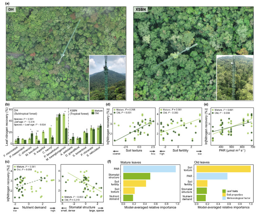 中国科学院植物研究所刘玲莉研究团队依托中国生态系统研究网络(CERN),在配备林冠塔吊平台的鼎湖山(亚热带常绿阔叶林)和西双版纳(热带雨林)两个野外台站,利用稳定性氮同位素(15N)示踪技术,量化了13个冠层优势树种成熟叶和老叶的叶片氮吸收能力,并进一步解析了叶片功能性状、土壤条件及气象因子对叶片氮吸收的调控机制。结果发现,在热带和亚热带天然林中,不同物种及不同叶龄叶片的氮吸收能力存在较大变异(5.3%~51.6%)。总体来看,成熟叶(21.4%)和老叶(19.6%)的平均氮吸收能力相近,但其调控机制存在明显差异。养分需求较高且气孔密度较大的叶片表现出更强的氮吸收能力。光合有效辐射(PAR)是促进两种叶龄叶片氮吸收的主要气象因子,而较高的土壤肥力会抑制成熟叶的氮吸收。进一步分析表明,对生理活性较高的成熟叶而言,叶片性状(如气孔结构和养分需求)是解释其氮吸收能力的关键因素;而对于老叶来说,叶片性状的重要性显著降低,环境条件,特别是土壤质地和光合有效辐射,成为影响氮吸收的主导因素。本研究定量评估了自然森林生态系统中冠层树木不同叶龄的叶片氮吸收能力,并揭示了成熟叶与老叶在氮吸收调控机制上的显著差异,为深入理解森林氮循环提供了关键科学依据。