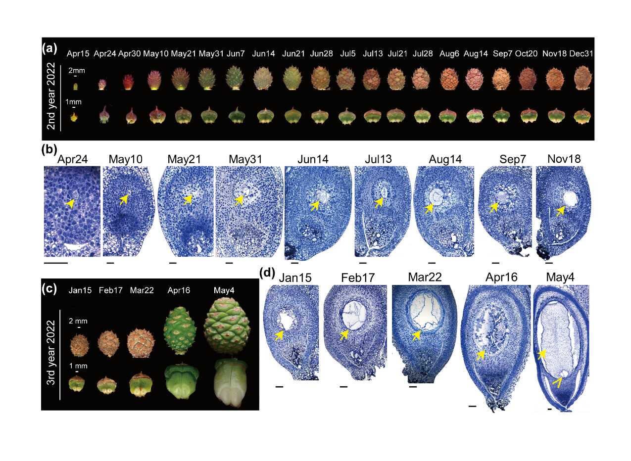 松科是裸子植物中最大的两个科之一,起源于侏罗纪,现存11属约230种植物,广泛分布于北半球。传统概念的松柏类植物包含松科等8个科、约614个物种,不及被子植物(开花植物)物种数的千分之二,但构成了全球39%的森林覆盖,具有极其重要的生态与经济价值。松科在漫长的进化历史中形成了独特、多样的生殖周期,主要分为三种类型:1)松属型,见于松科第一大属——松属及其姐妹类群银杉属,其生殖周期长达三年,从生殖芽分化到球果成熟跨越三个生长季,且授粉与受精相隔约一年;2)云杉属型,包括云杉属、落叶松属、冷杉属等八个属,其生殖周期为二年,生殖芽于第一年形成,授粉与受精均在第二年完成,两者间隔约2至4个月;3)雪松属型,其生殖周期同样为二年,但秋季授粉、次年受精。在这三类生殖周期中,雌配子体发育的时序进程是否一致?其遗传调控机制又是什么?该生殖周期多样性具有怎样的适应意义?特别值得注意的是,松属植物的“球果”普遍存在“夏季休眠”现象—即在生殖周期第二年完成授粉后,未受精的“球果”于夏季进入发育停滞阶段。这一独特现象受何种分子机制调控?
