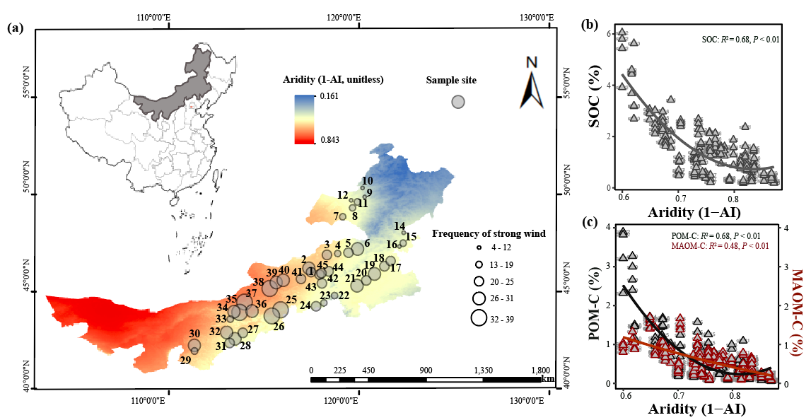 在全球气候变暖背景下,温带草地生态系统正面临日益加剧的干旱胁迫。干旱通过影响植被生长、微生物活动及土壤理化过程,显著影响了土壤有机碳(SOC)的形成、稳定与储量。然而, SOC及其不同组分在干旱梯度上是否存在由缓慢变化转为快速下降的干旱临界阈值,以及植被特征和风蚀等物理过程如何共同影响这一变化过程,仍缺乏系统认识。