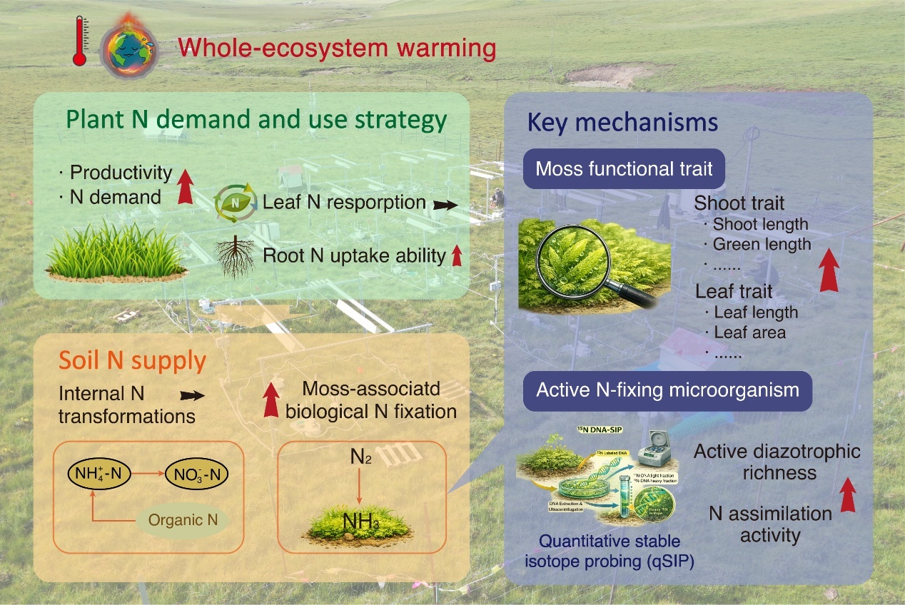 针对上述研究不足,中国科学院植物研究所杨元合研究团队依托在青藏高原多年冻土区建立的全生态系统增温实验平台,基于15N同位素示踪、定量稳定同位素核酸探针技术(qSIP)及高通量测序等方法,系统测定了涵盖植被氮需求、氮利用策略及土壤氮供给在内的43个指标,在此基础上解析了冻土生态系统氮供需关系对气候变暖的响应特征和驱动因素。研究人员发现,增温虽显著提高植被氮需求,但未改变叶片氮重吸收效率,表明植物主要通过吸收土壤中的有效氮来满足其增加的氮需求。然而,增温处理下土壤氮转化速率未发生显著变化,苔藓固氮速率却显著增加。增温背景下苔藓固氮增加量约占植被氮需求增加量的48%,表明苔藓固氮在满足植被氮需求中起着关键作用。进一步研究发现,苔藓固氮对增温的响应受苔藓功能性状以及附生在苔藓叶片的活性固氮微生物共同调控。该研究揭示了气候变暖背景下冻土生态系统氮供需关系的变化特征及其驱动机制,为深入理解冻土生态系统碳–氮交互作用提供了关键实验证据。