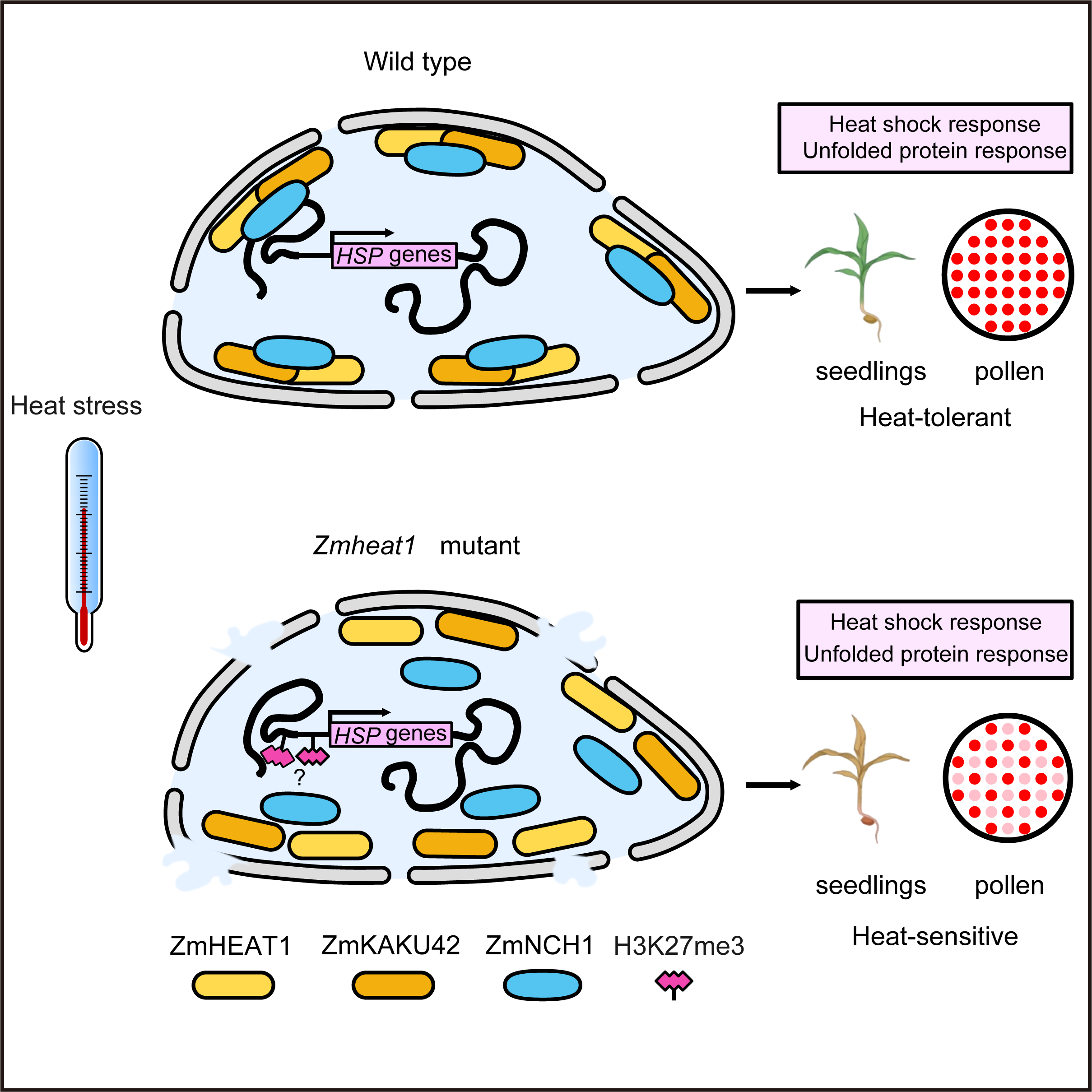 中国科学院植物研究所张梅研究团队以257份玉米自交系为材料,以高温胁迫下花粉活力下降率为生殖期耐热性指标,开展全基因组关联分析,成功定位到与花粉耐热性显著相关的关键基因ZmHEAT1。该基因编码核膜蛋白且存在Hap T和Hap A两种单倍型,其中Hap T为耐热优异单倍型,主要存在于热带/亚热带玉米中,携带该单倍型的玉米在高温胁迫下花粉活力下降率显著降低。进一步分子机制解析表明,Zmheat1敲除突变体在高温下花粉活力、结实率及产量均大幅下降,苗期存活率降低,活性氧大量积累;而过表达株系则显著提升苗期与生殖期耐热性,高温下结实率明显优于野生型,证实ZmHEAT1正向调控玉米耐热性。团队进一步研究发现,ZmHEAT1与其同源蛋白ZmKAKU42共定位于核膜,二者在体内外均可直接互作,并共同结合核骨架蛋白ZmNCH1,形成稳定的核膜蛋白复合物。Zmkaku42敲除突变体同样表现为热敏感,双突变体热敏感表型更为突出,表明二者功能冗余、协同调控耐热性。该核膜蛋白复合物通过维持高温下核膜结构完整性,调控热激蛋白基因HSP90-2、HSP17.4的表达,进而调控玉米耐热性。
